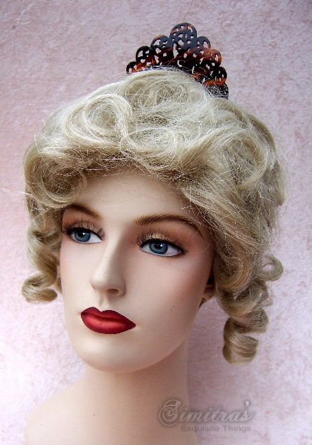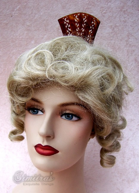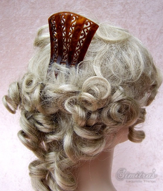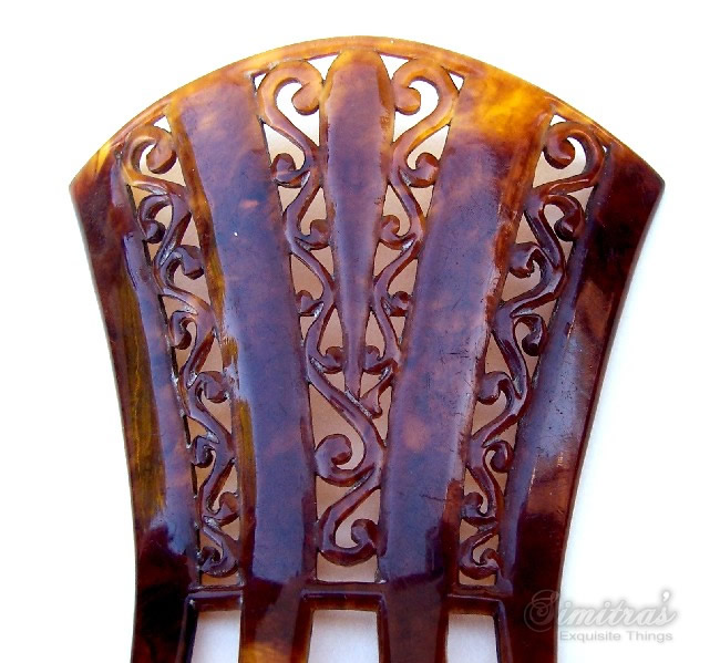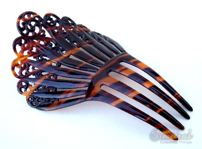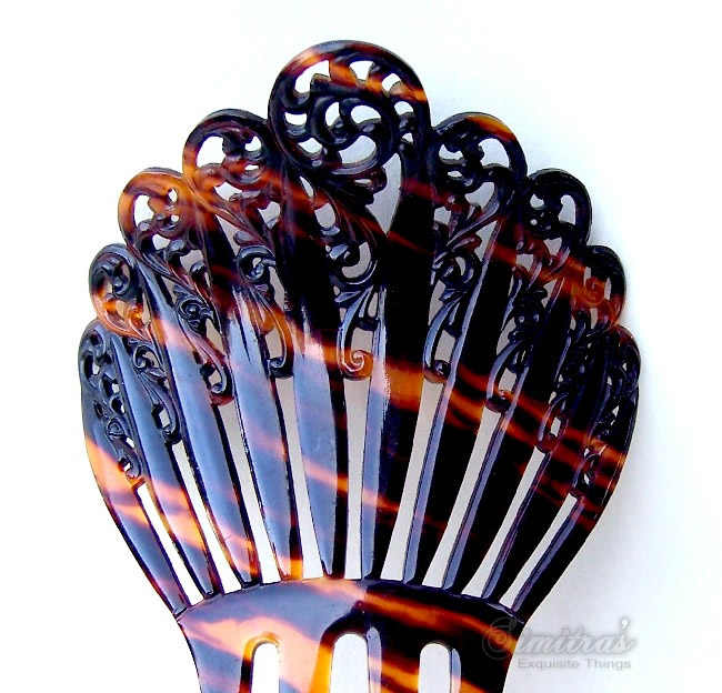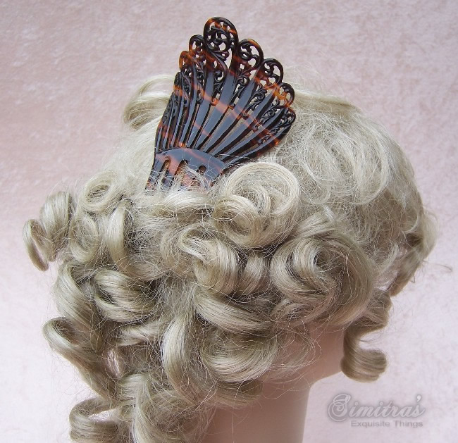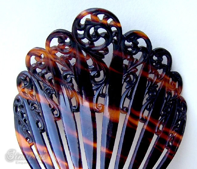 By  the late 19th century genuine tortoiseshell had become an expensive  luxury material and was widely imitated by celluloid faux tortoise effects. Picture 6 is from a contemporary photograph and show how  large mantilla combs like this were worn standing proud of the head.