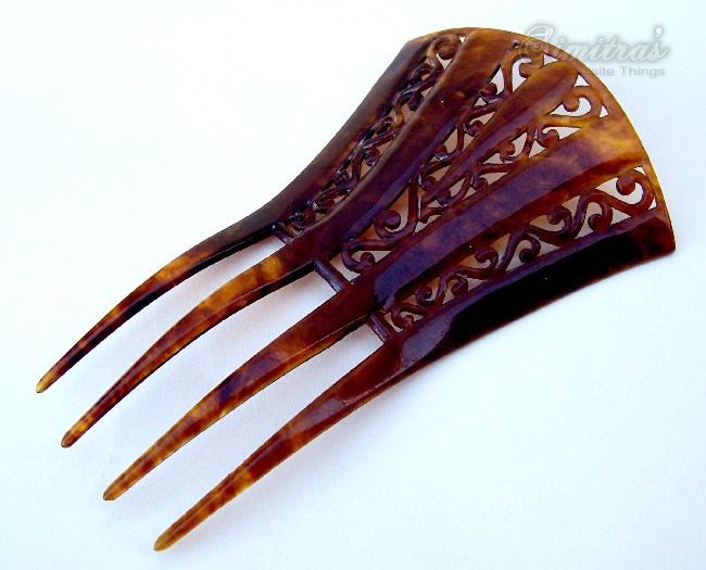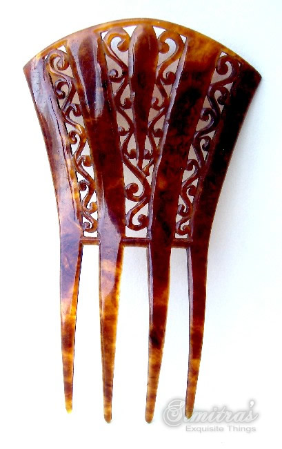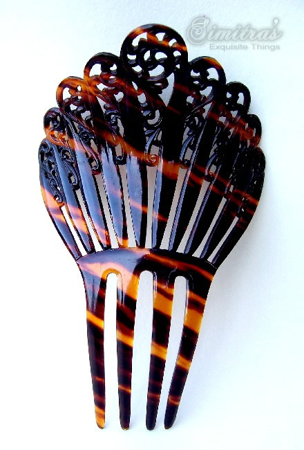 Such  combs became very popular from the 1870s with the opening of the opera Carmen. They remained in fashion well into the 20th  century. This one has an openwork design with solid panels alternative with  those featuring open scrollwork.