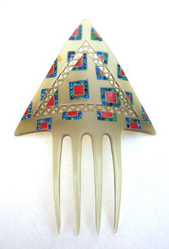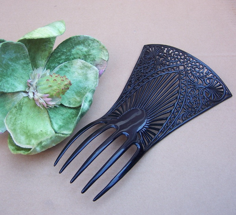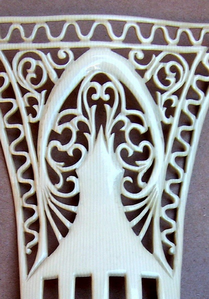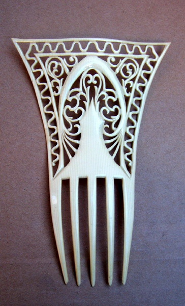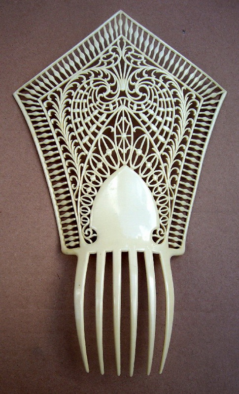 This large and very beautiful French Ivory hair comb has a tall wedge shaped  heading with openwork of lace like delicacy. Combs of this shape, especially in  asymmetric designs, are typically from the 1910s – 1920s period.