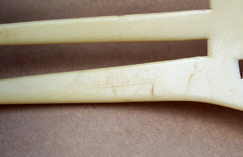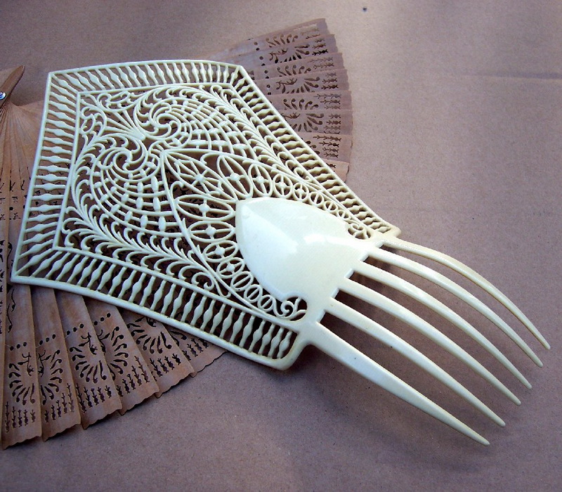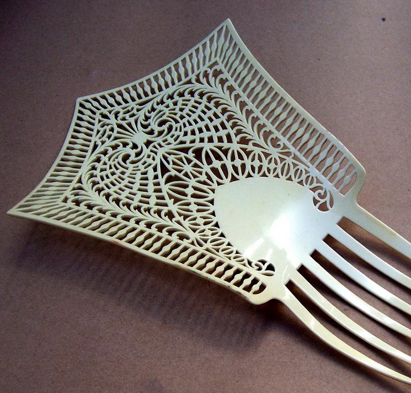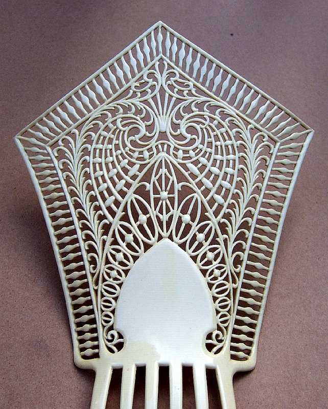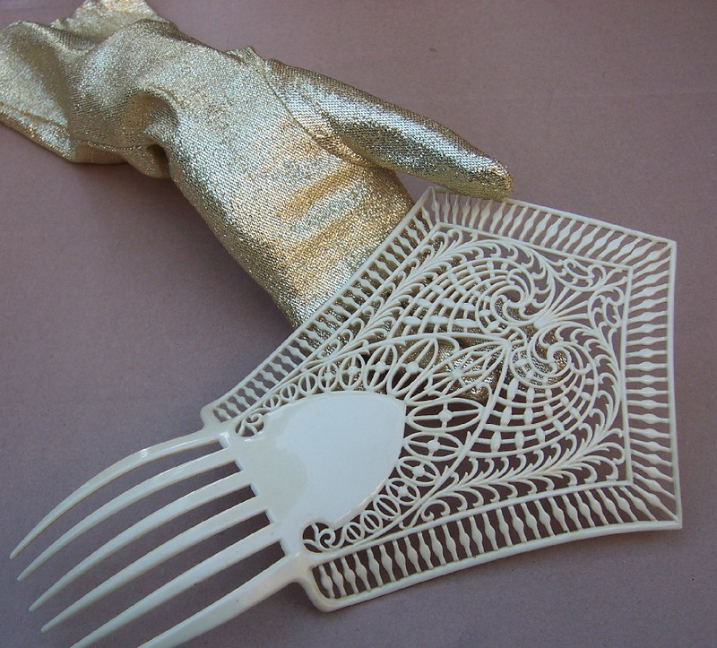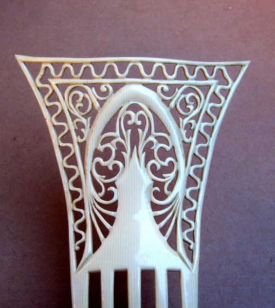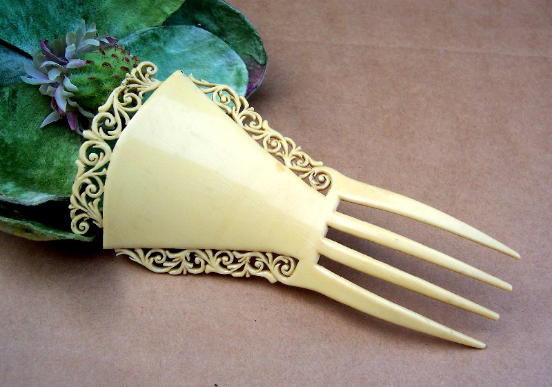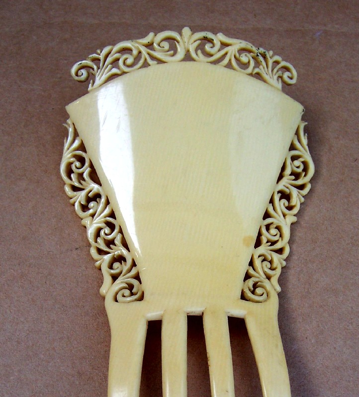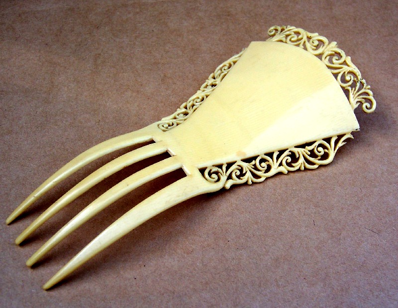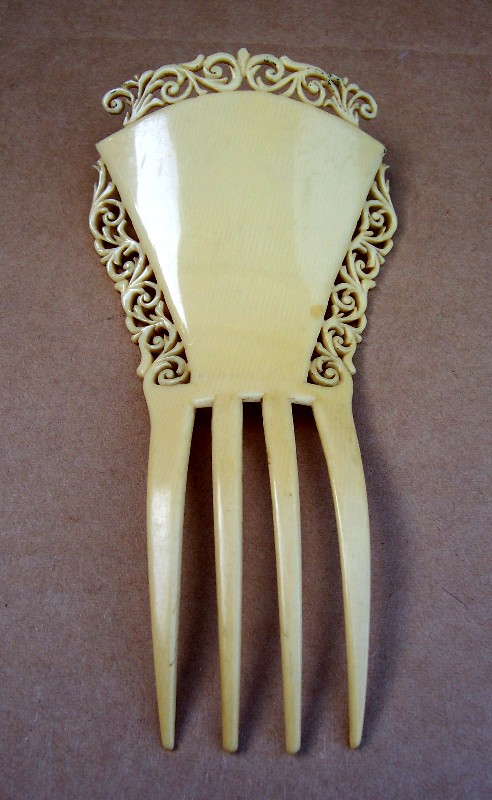 This comb is of the type known as a Spanish or mantilla  comb because it resembles the traditional ornaments worn by Spanish ladies with  their native dress. The ornament is made from an early celluloid substance,  popularly known as French ivory, because it was invented to substitute for the  much more expensive elephant ivory which was becoming rare and expensive by the  early 20th century.