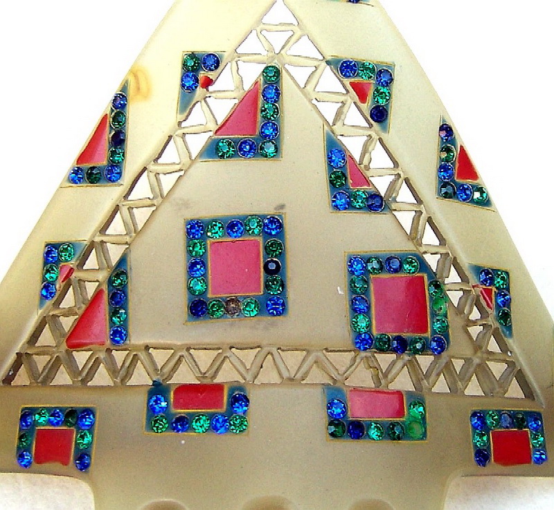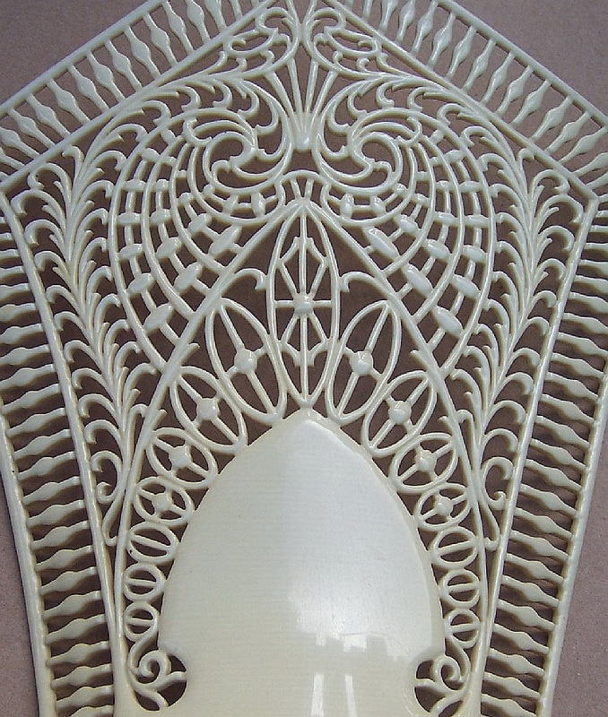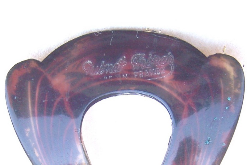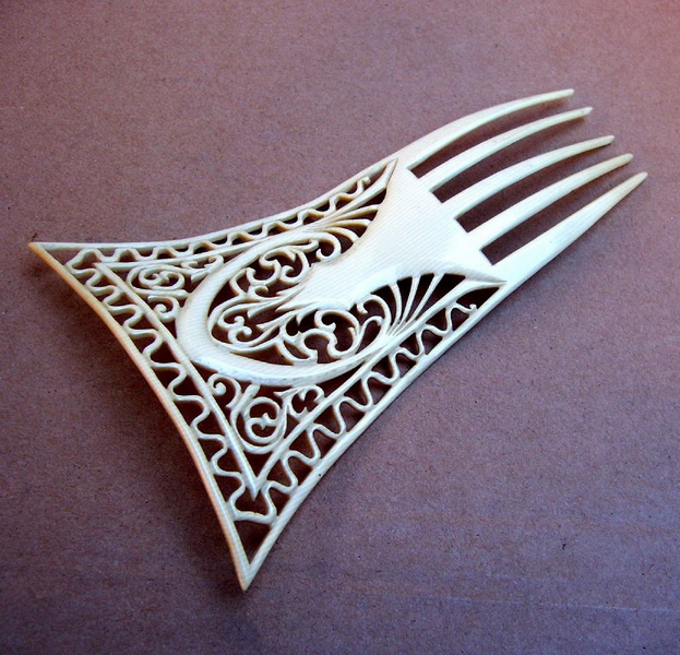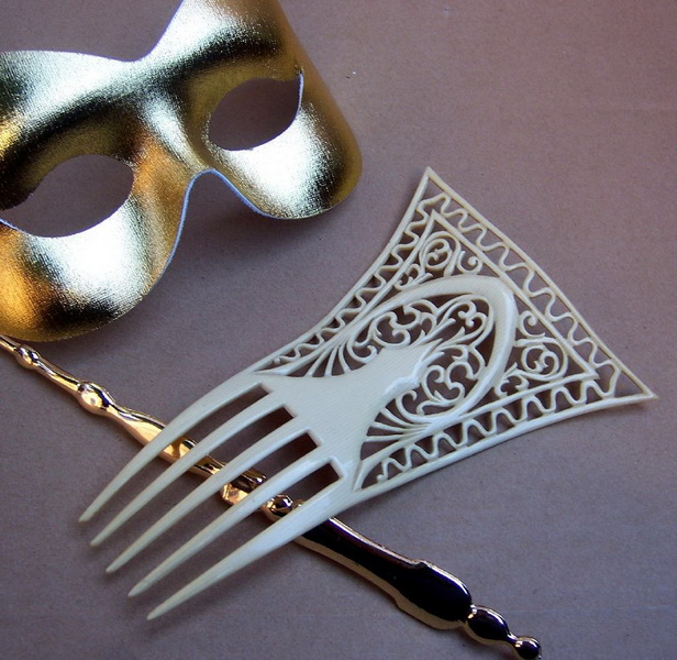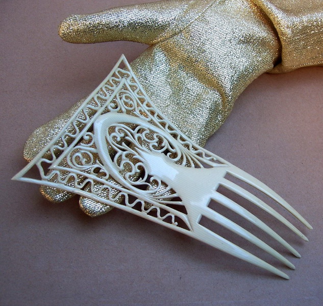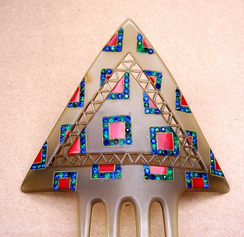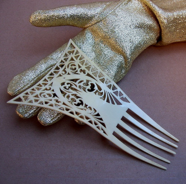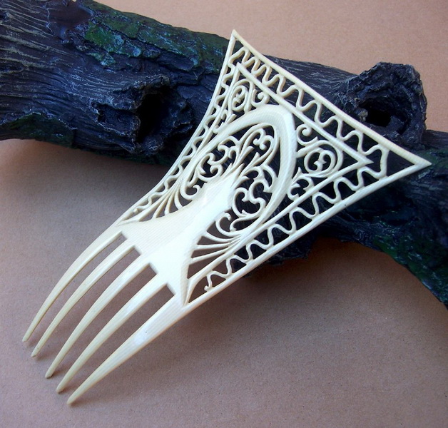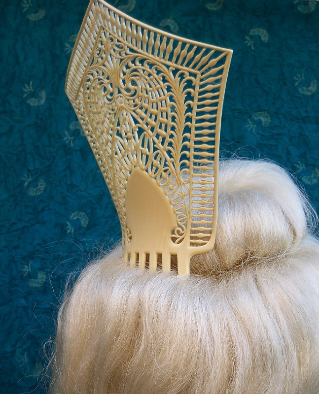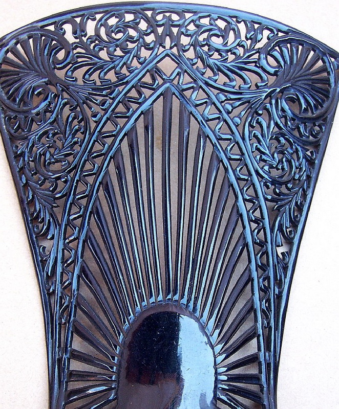 This comb is of the type known as a Spanish or mantilla  comb because it resembles the traditional ornaments worn by Spanish ladies with  their native dress. The ornament is made from an early celluloid substance,  popularly known as French ivory, because it was invented to substitute for the  much more expensive elephant ivory which was becoming rare and expensive by the  early 20th century.
