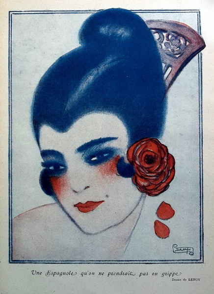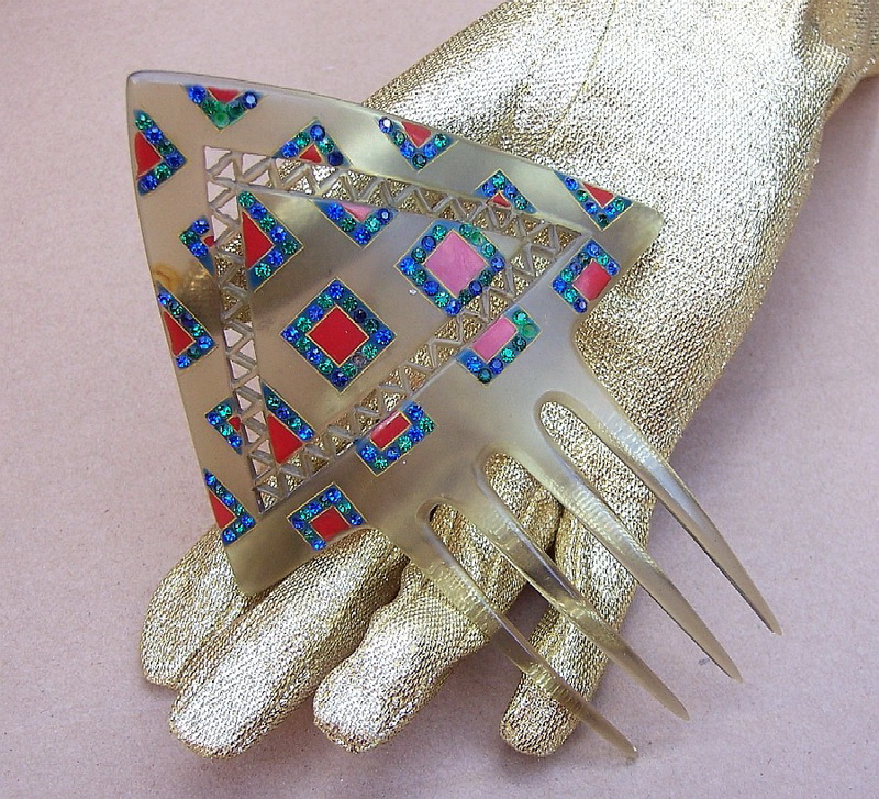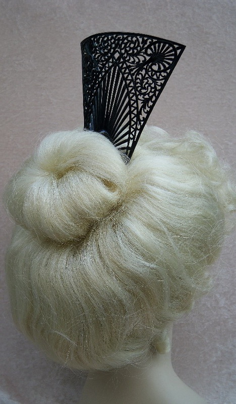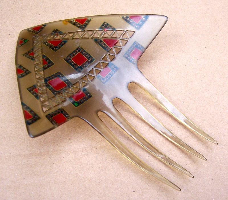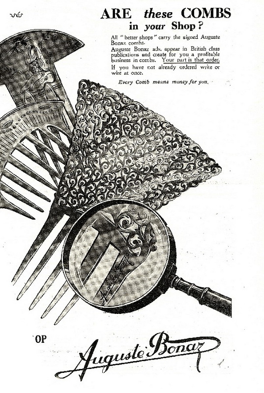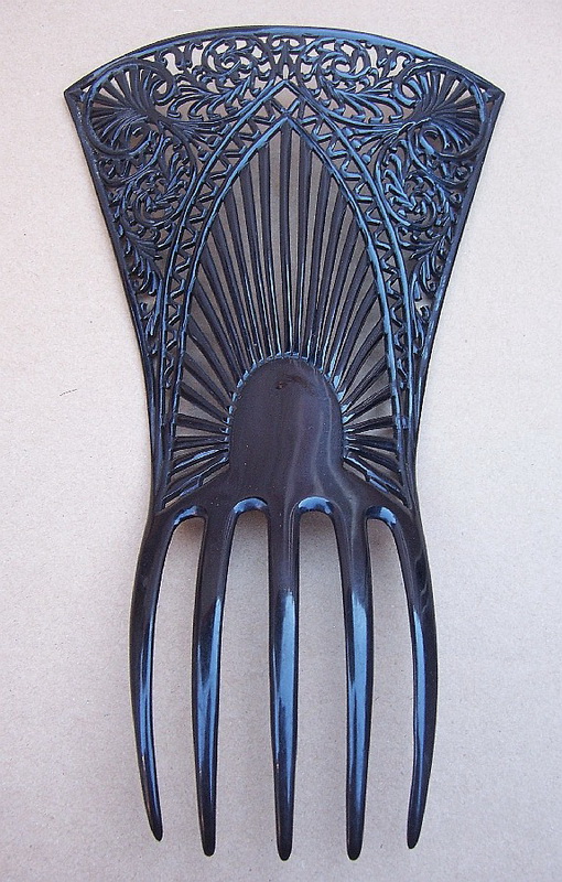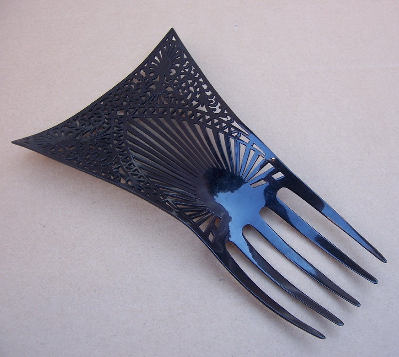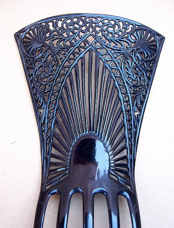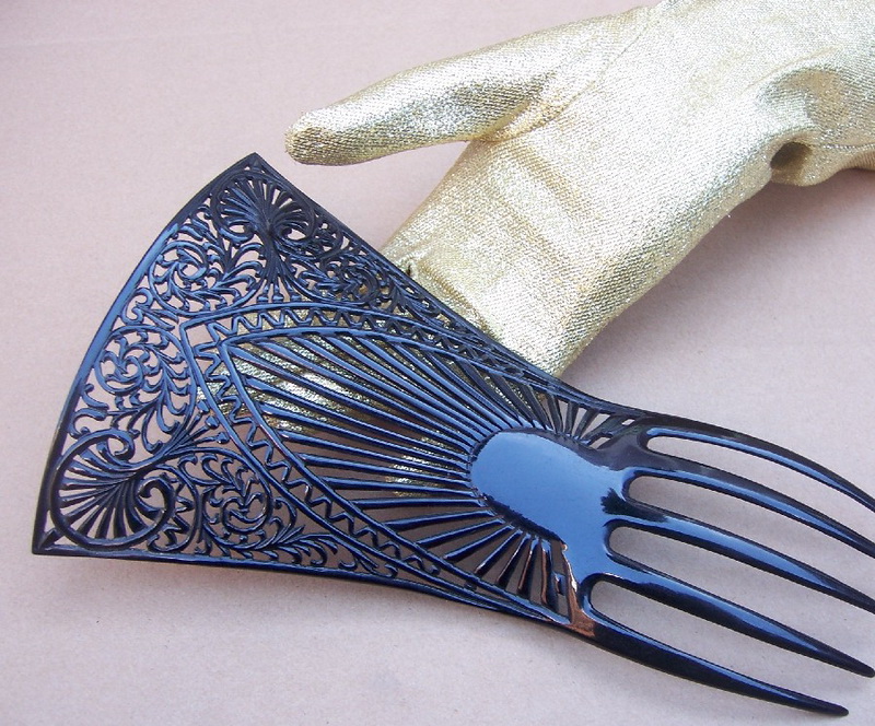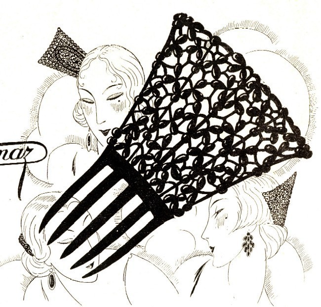 Combs like this were worn as shown in picture 9 which is taken from a  contemporary fashion plate in a contemporary French magazine. We can see that  the sitter is wearing a similarly shape comb and has placed at a jaunty angle  in the hair so that the beautiful openwork heading can be seen from all angles.  Her appearance is in the Spanish fashion which was in vogue during the early  20th century.