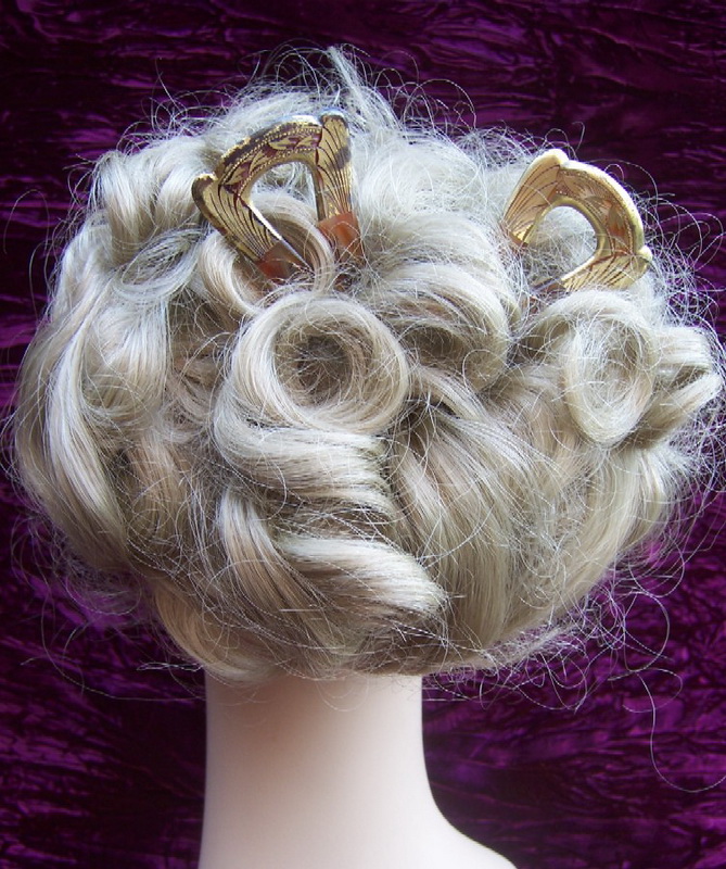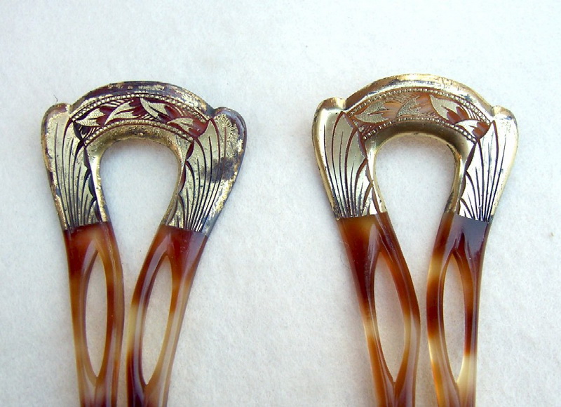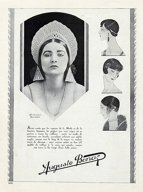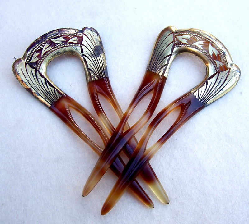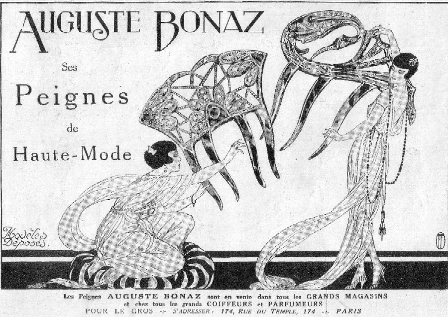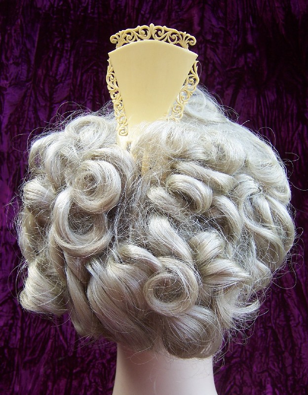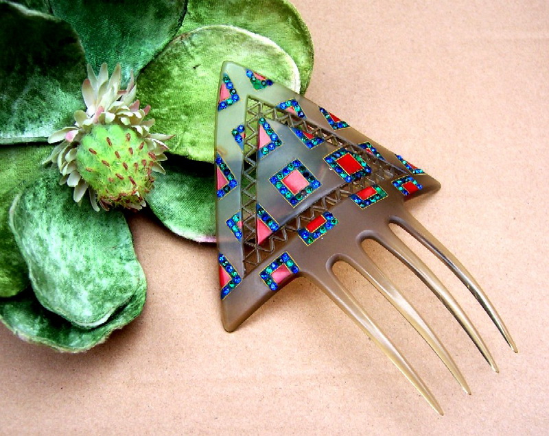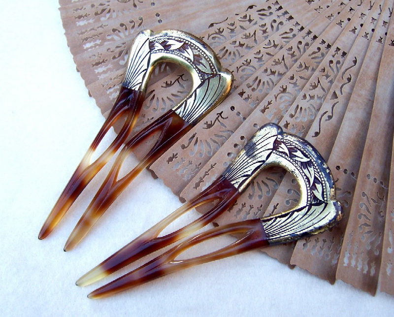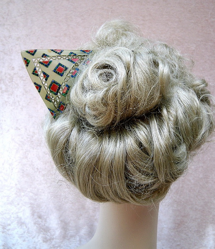 Combs like this were worn as shown in picture 9 which is taken from a  contemporary fashion plate in a contemporary French magazine. We can see that  the sitter is wearing a similarly shape comb and has placed at a jaunty angle  in the hair so that the beautiful openwork heading can be seen from all angles.  Her appearance is in the Spanish fashion which was in vogue during the early  20th century.