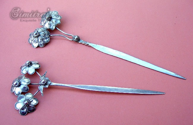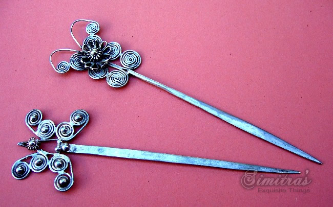 This is a pair of pretty handmade silver tone single  pronged hairpins made by ethnic Tibetan tribe’s people living in what is now China.  They exhibit the great tradition of hand workmanship of the Tibetan peoples and  are made in delicate openwork filigree.
