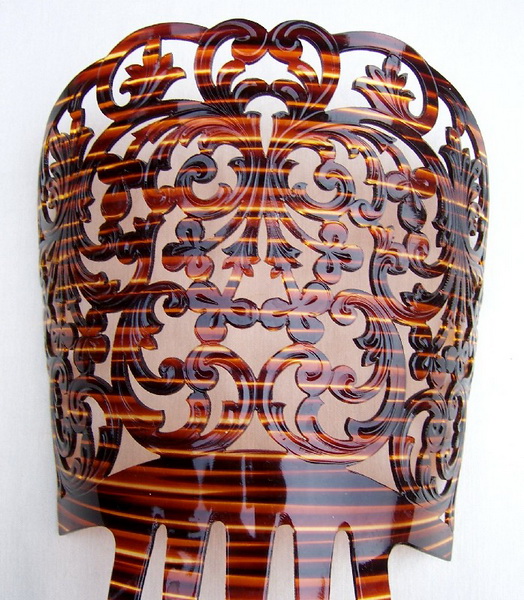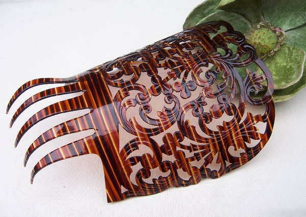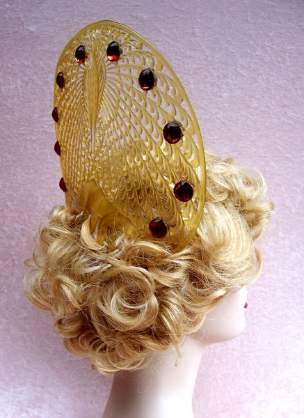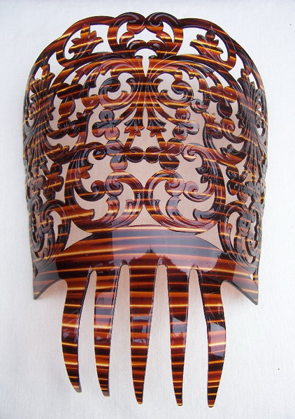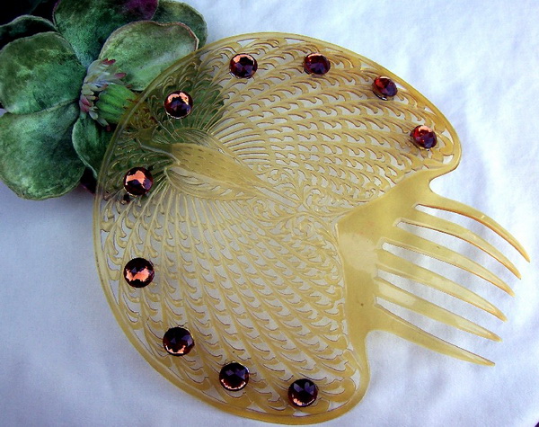 This is one of the most unusual mantilla combs I have seen. It is made in blonde translucent celluloid of a pale champagne colour and probably dates from the later 20th century.