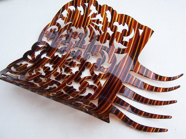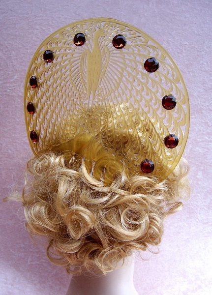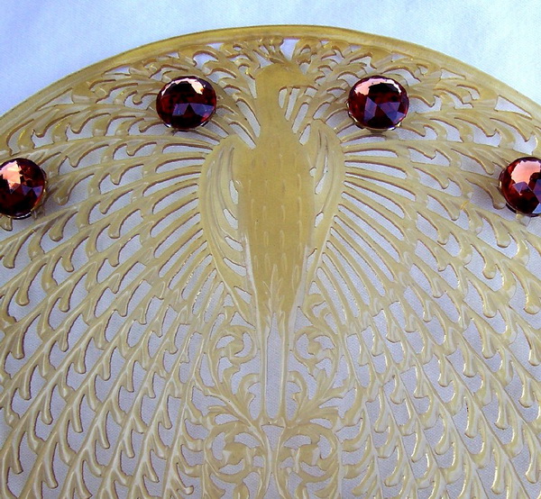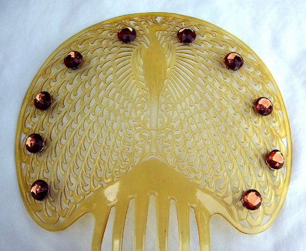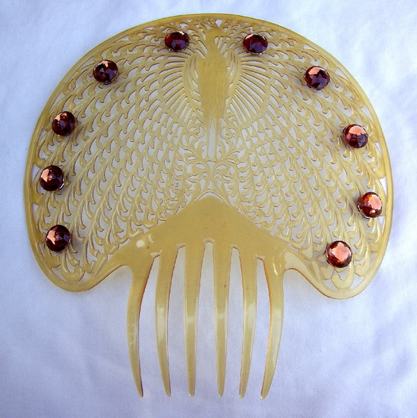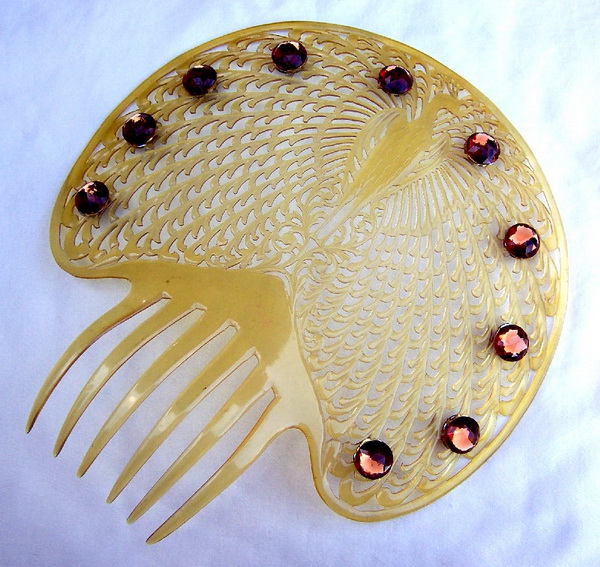 The design takes the form of a peacock whose spreading tail forms the curved heading of the comb. The design is further embellished with gold coloured acrylic “jewels” which adorn both the outer and inner curve.