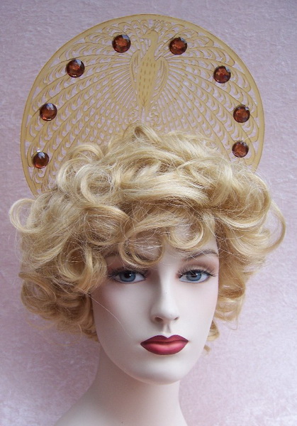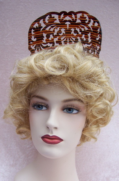 It produces a wide curved silhouette of medium height when worn with the mantilla veil, as seen on the mannequin. It has an attractive scalloped profile and a conventional design of combined leaf and scrollwork motifs.