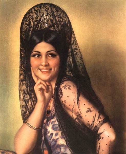 The final picture is taken from a contemporary coloured postcard of the same period and shows a model with a very large and high comb of similar period.