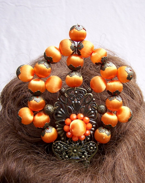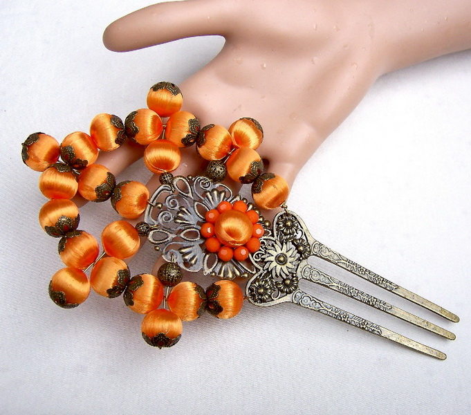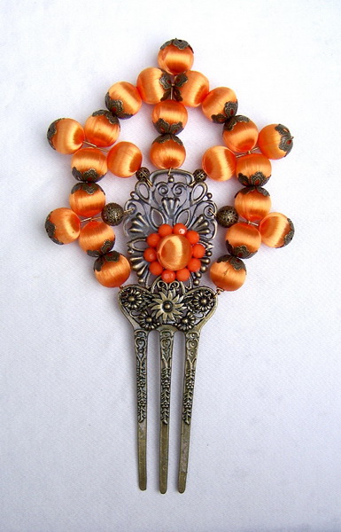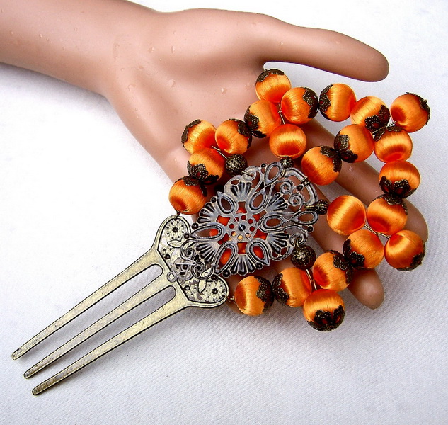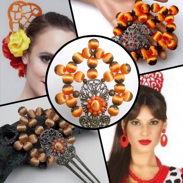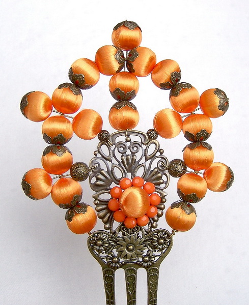 This attractive traditional mantilla style hair accessory or peineta has a metal comb base done in antiqued silver tone. It is decorated with satin balls in bright orange.