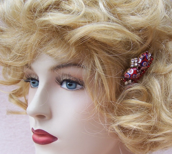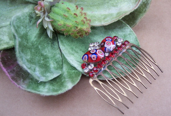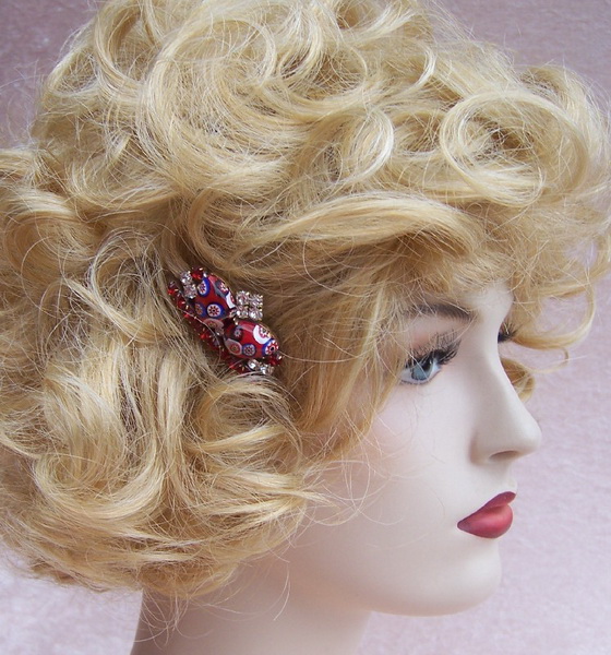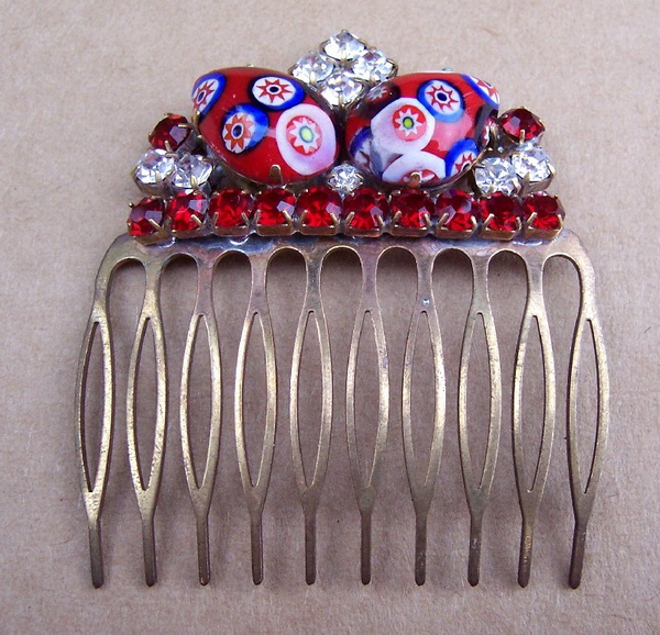 This handsome little side comb was hand made in the Czech Republic in the mid to later 20th century. It has a brass comb mount with split prongs and an elaborate heading set with two oval millefiore design cabochons. These are surrounded by red and clear prong set rhinestones.