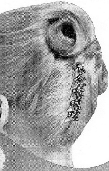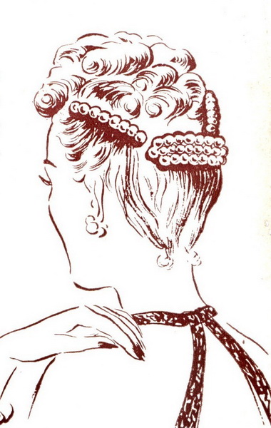 The final illustration is taken from a contemporary ad in American Hairdresser 1960 and shows contemporary hair accessories in the elaborate Baroque style.