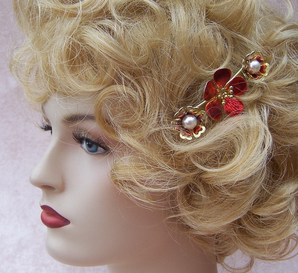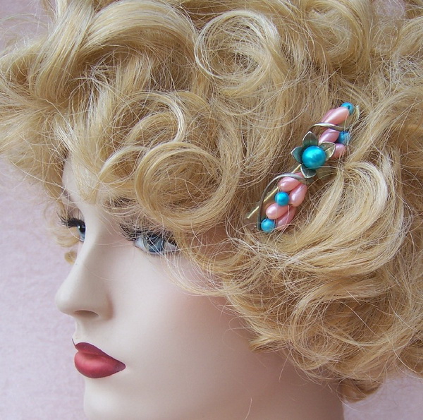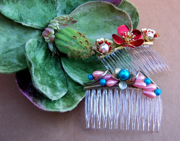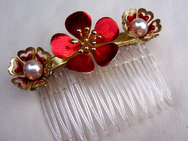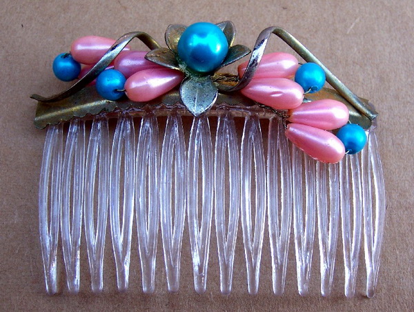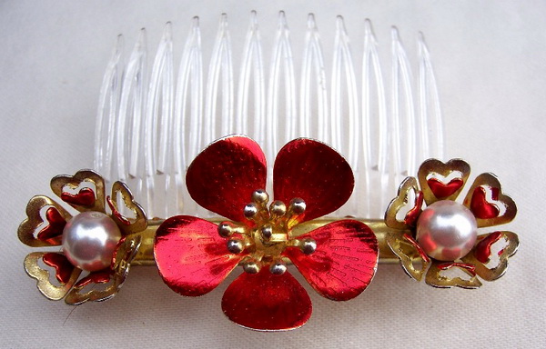 The first comb features a formalised cluster of pink and blue pear shaped faux pearls combined with scrollwork. The companion piece has three large flowers made from red and gold tone metal with large spherical faux pearls set in the centres.